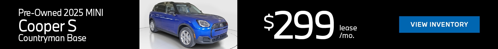 Monthly lease payments of $279 per month for 39 months is based on an adjusted capitalized cost of $32,870 (MSRP of $36,775, including Signature Plus Trim and destination & handling fee of $1,175, less $2,245 capitalized cost reduction, $0 security deposit and suggested dealer contribution of $660 and $500 National Credit, $500 Customer Cash). Cash due at signing includes $2,000 capitalized cost reduction, $279 first month's payment, $925 acquisition fee and $0 security deposit. Lessee responsible for insurance during the lease term, excess wear and tear as defined in the lease contract, $0.25/mile over 22,500 miles (7,500 miles/year) and a disposition fee of $395 at lease end (not to exceed an amount permissible by law). Disposition Fee may vary by state. Not all customers will qualify for security deposit waiver. Tax, title, license, registration and dealer fees are additional fees due at signing. Advertised monthly payment does not include applicable taxes. Purchase option at lease end is $22,801 plus Purchase option fee disclosed in the lease contract. Additional tax, title, and government fees may also apply. Other credits for loyal customers may apply. National Credit not combinable with MINI Loyalty Credits. Offer valid through April 30, 2025 and may be combined with other offers unless otherwise stated.